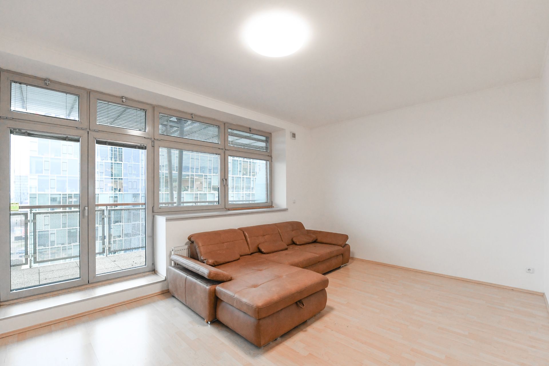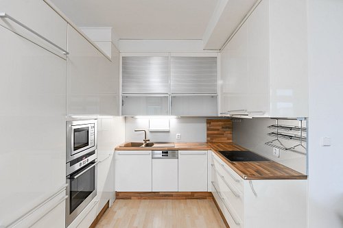 Byt tvoří předsíň (s vestavnou skříní), obývací pokoj s kuchyňským koutem a vestavnými spotřebiči, samostatná toaleta. Kuchyně vybavena vestavnou lednicí s mrazničkou, horkovzdušnou troubou, myčkou, mikrovlnnou troubou, varnou deskou a digestoří. Z obývacího pokoje je vstup na prostorný balkon. Obývací pokoj s jídelnou vybaven gaučem, konferenčním stolkem, jídelním stolem a židlemi.