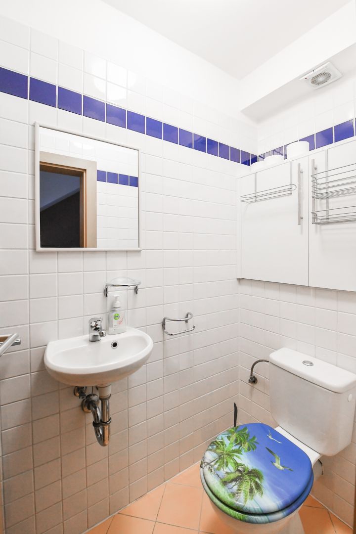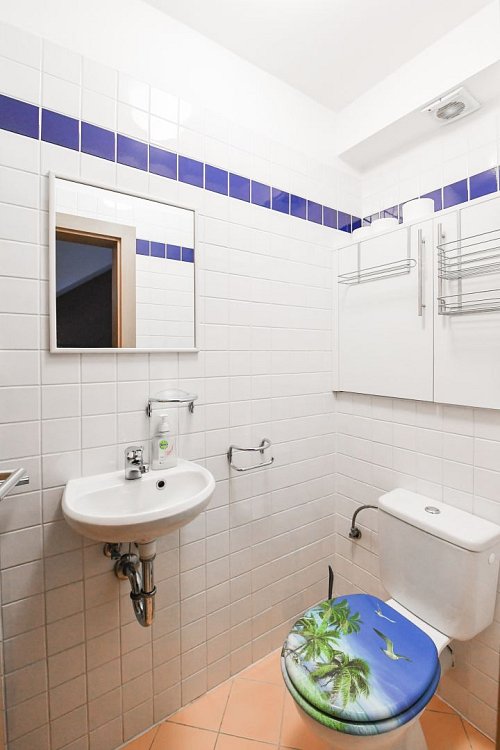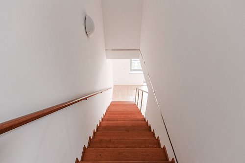 V horním patře se nachází tři ložnice, koupelna s vanou, pračkou a toaletou. Dvě ložnice vybaveny dvoulůžkovou postelí s matracemi a vestavnými skříněmi, třetí ložnice vybavena gaučem. Ze třetí ložnice je vstup na druhý balkon.